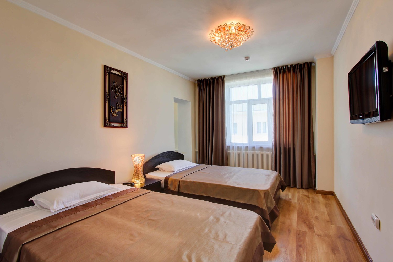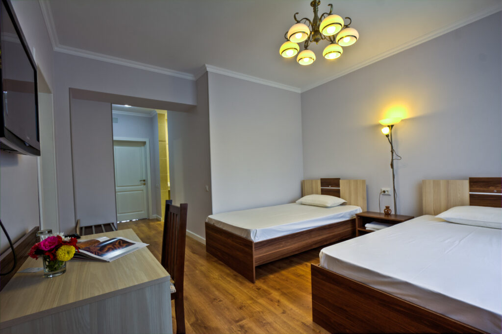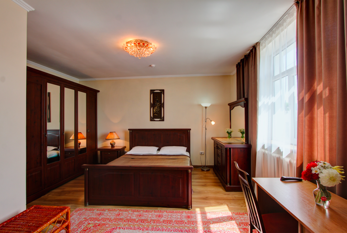 Современная гостиница, предлагающая размещение в 1-,2-,3-местных номерах класса «стандарт», «полулюкс», «люкс». Комнаты оформлены в светлых и мягких тонах с уютным дизайном напоминающие домашнюю атмосферу. Удобные кровати, мебель, шторы, постельные принадлежности подчеркивают изысканность и утонченность декора. Каждый номер оборудован спутниковым телевидением, туалетом и душем с холодной и горячей водой, феном и индивидуальной системой отопления. В течении дня в неограниченных количествах- чай и кофе, варенье, печенье.