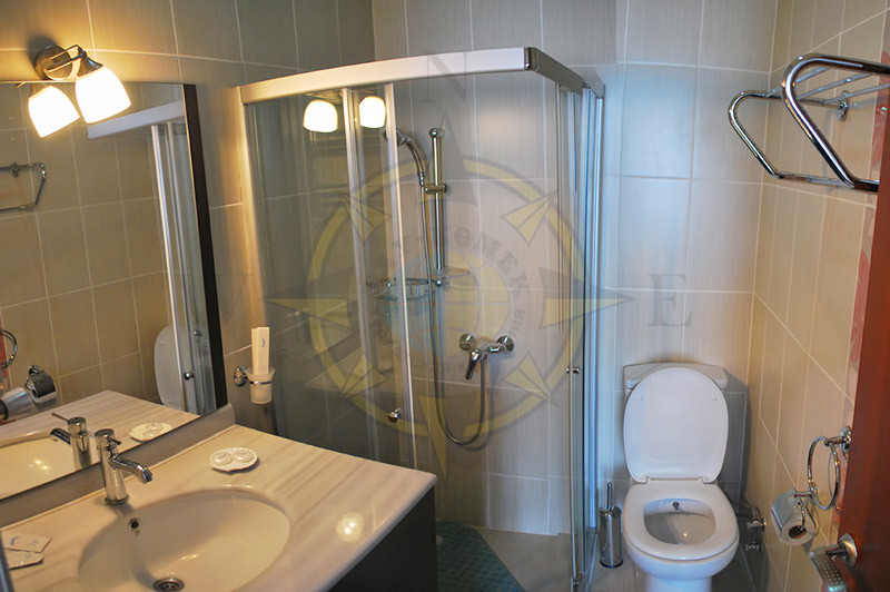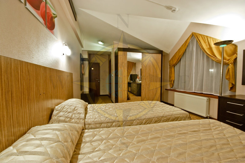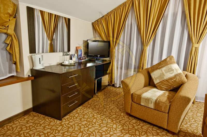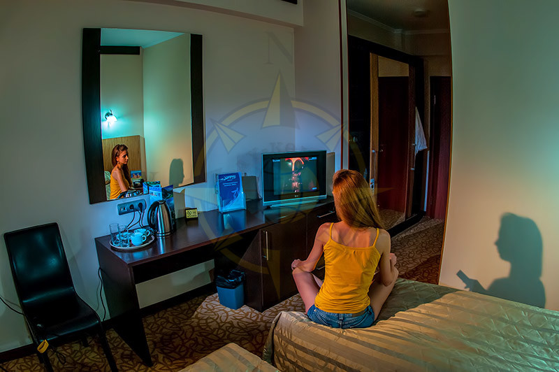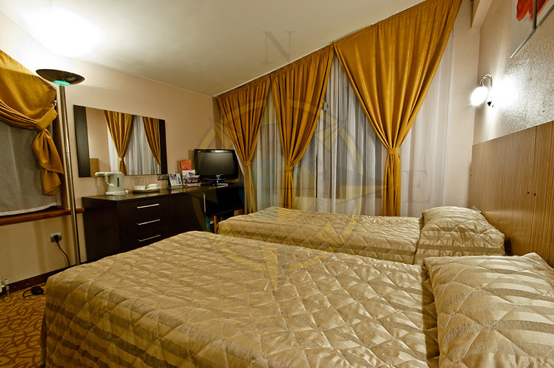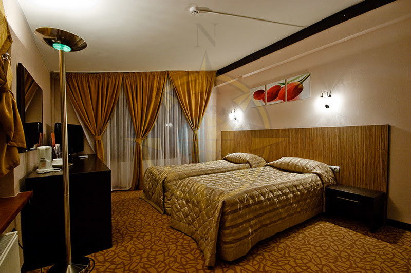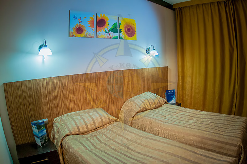 Размещение. Отель включает в себя 48 номеров категории -Twin Room и 4 номера категории Suite Room. Номера расположены на 1,2,3,4 этажах. В каждом номере: раздельные односпальные кровати c возможностью объединения, открывающиеся окна, шкаф-купе, телевизор, два кресла, журнальный столик, мини-бар, электрический чайник, набор посуды, санузел с душевой кабиной, фен, телефон, Internet, сейф, стационарный электрический обогреватель. В санузле одноразовое полотенце, одноразовый шампунь, комплект полотенец (банное, для лица, салфетки для ног).
