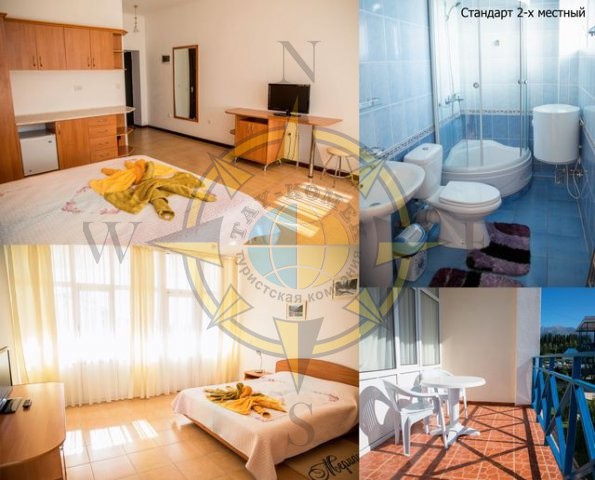 Стандарт – Два 3-х этажных капитальных корпуса, 2-х и 3-х местные однокомнатные номера с балконами. На первом этаже вход в номер с балкона. В номере встроенная кухня с набором посуды, телевизор, холодильник, 2-х спальная кровать и полуторка дополнительно в 3-х местных номерах, большая ванная комната с душевой кабиной. На балконе мебель (стол, стулья). В номерах регулируемое отопление пола. Номера с видом на озеро и горы.