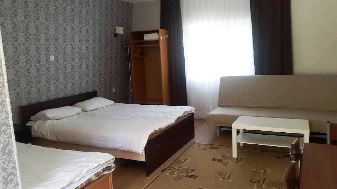 В номере: кровати, диван, прикроватные тумбочки, шкаф, телевизор, холодильник, стол и стулья, чайник, необходимая посуда, санузел, душ с х/г водой.
