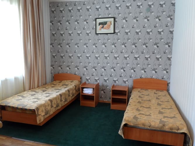 В каждом номере: раздельные кровати, прикроватные тумбочки, шкаф, телевизор, холодильник, стол и стулья, чайник, необходимая посуда, санузел, душ с х/г водой.